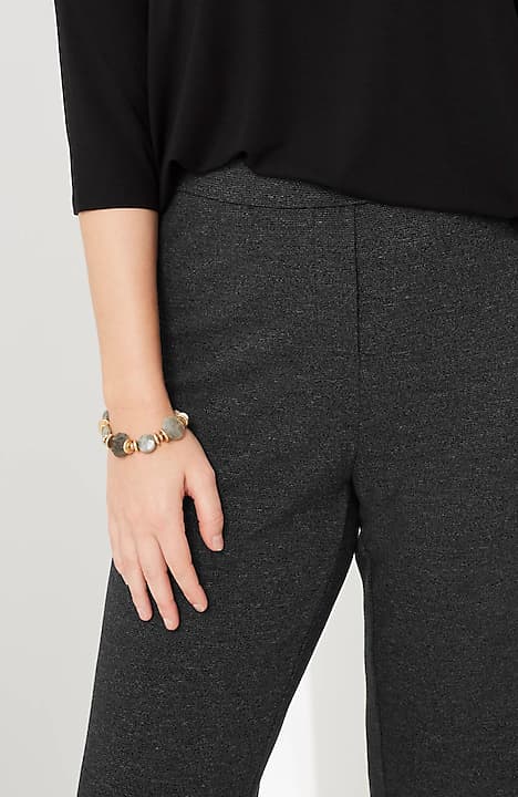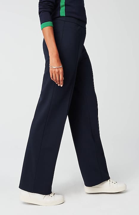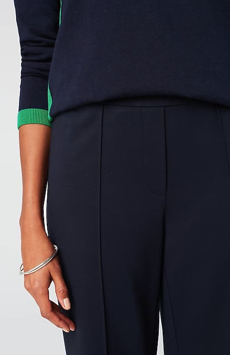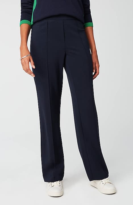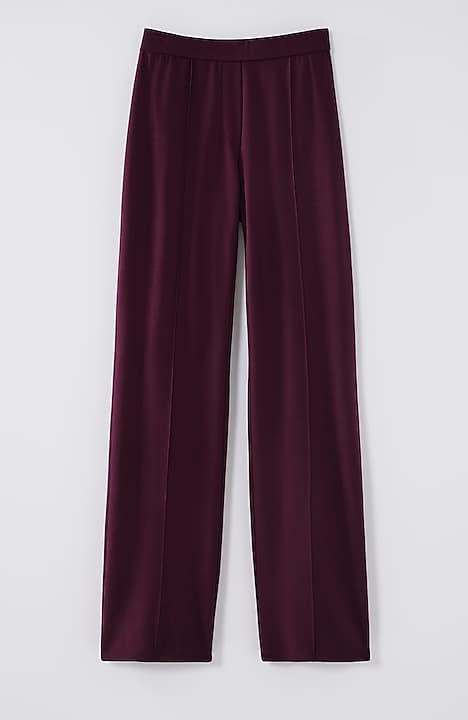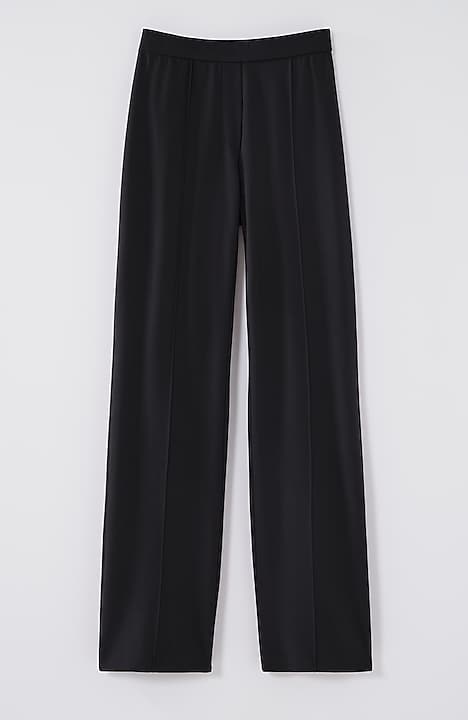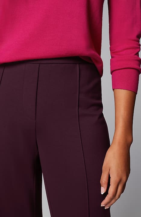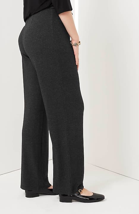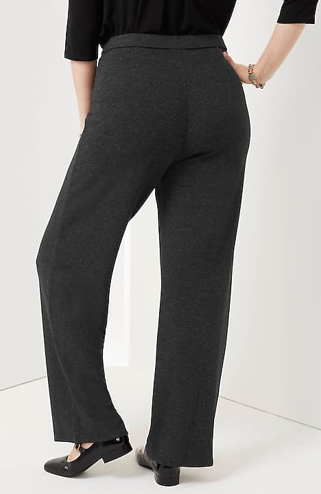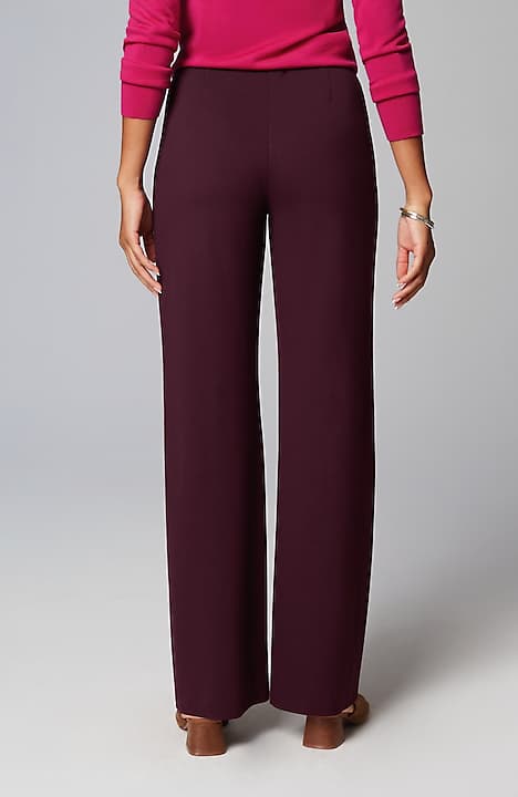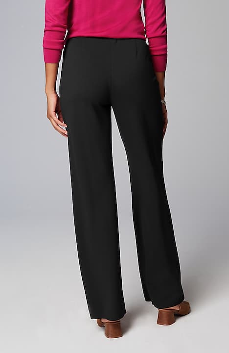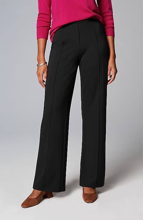 Designed in a soft, more substantial rayon-blend jersey knit, our pull-on pants are a style you'll enjoy wearing in virtually any season. The fabric is double-knit so it's slightly structured with a medium weight, a smooth polished finish and an easy drape. The slightly fuller leg flatters every body. A flat elasticized waistband and back darts create a comfortable fit that looks custom. Faux fly. Center-front pintucks finish the look.
