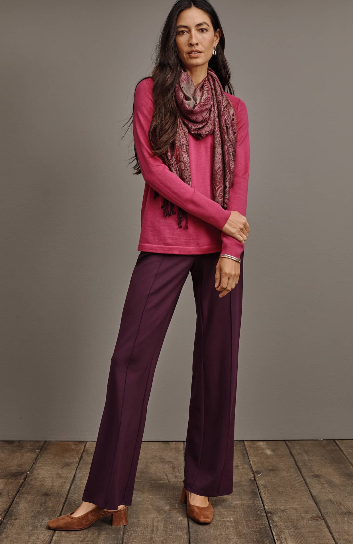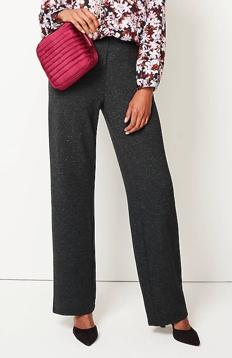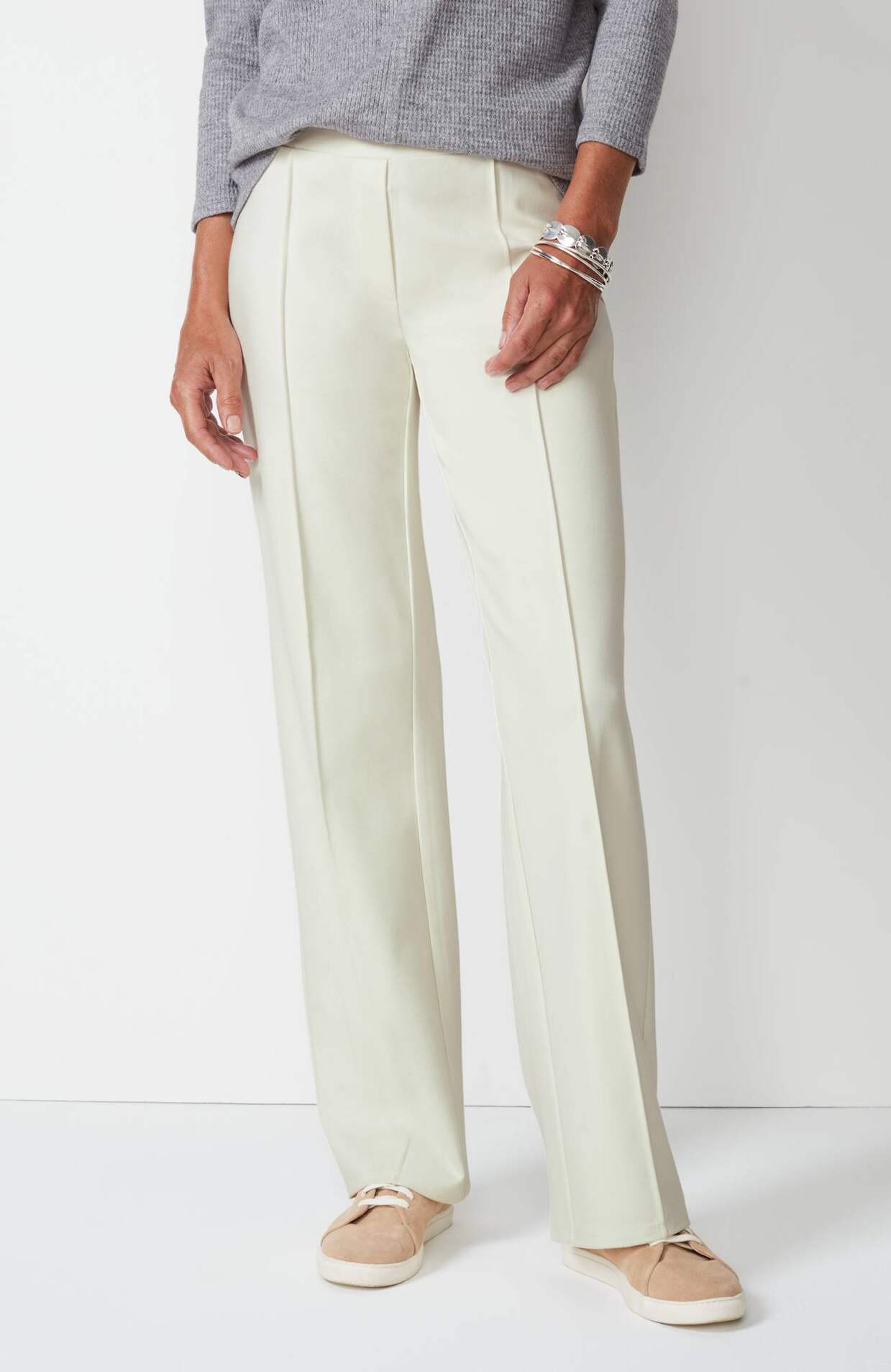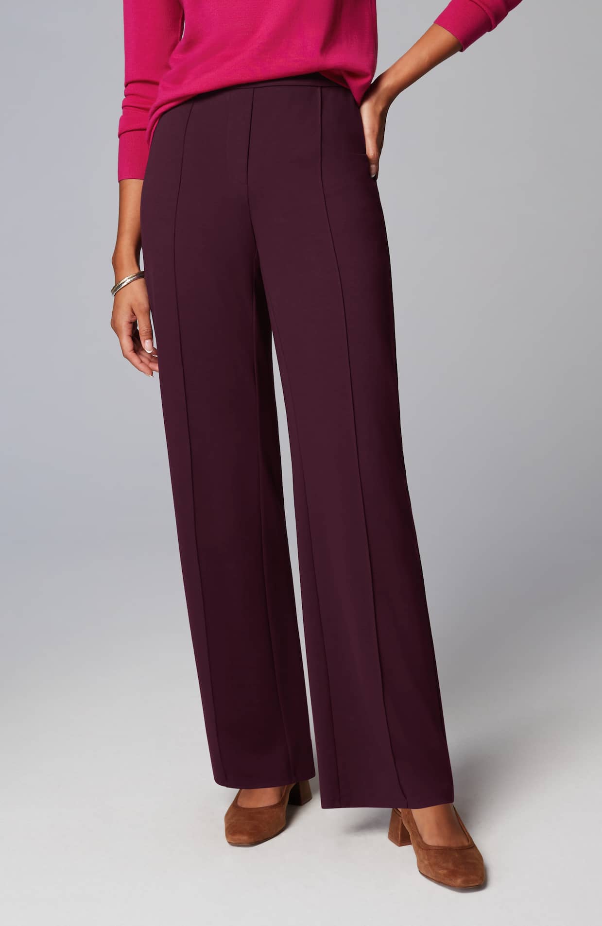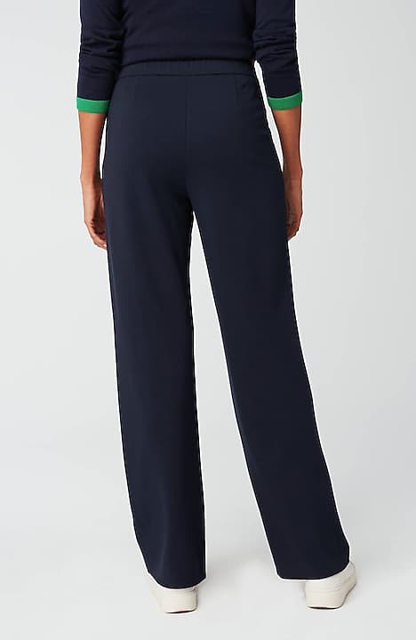 Designed in a soft, more substantial rayon-blend jersey knit, our pull-on pants are a style you'll enjoy wearing in virtually any season. The fabric is double-knit so it's slightly structured with a medium weight, a smooth polished finish and an easy drape. The slightly fuller leg flatters every body. A flat elasticized waistband and back darts create a comfortable fit that looks custom. Faux fly. Center-front pintucks finish the look.