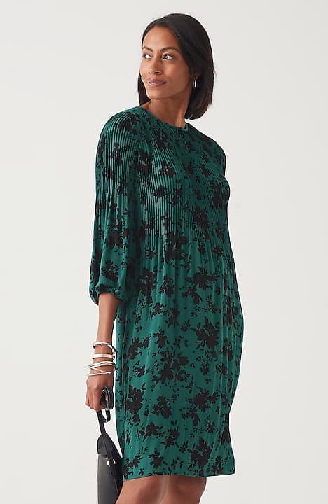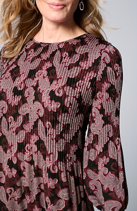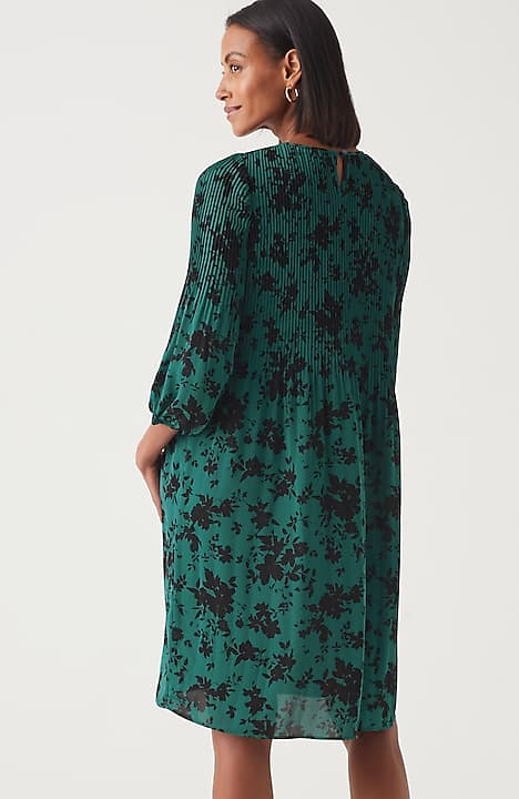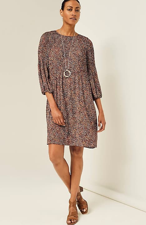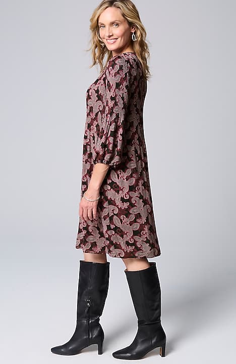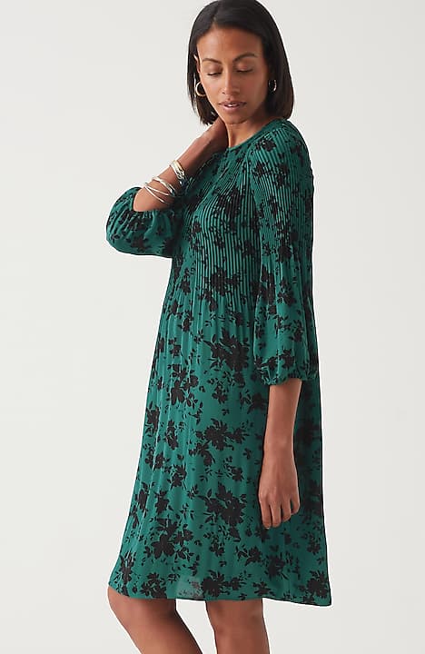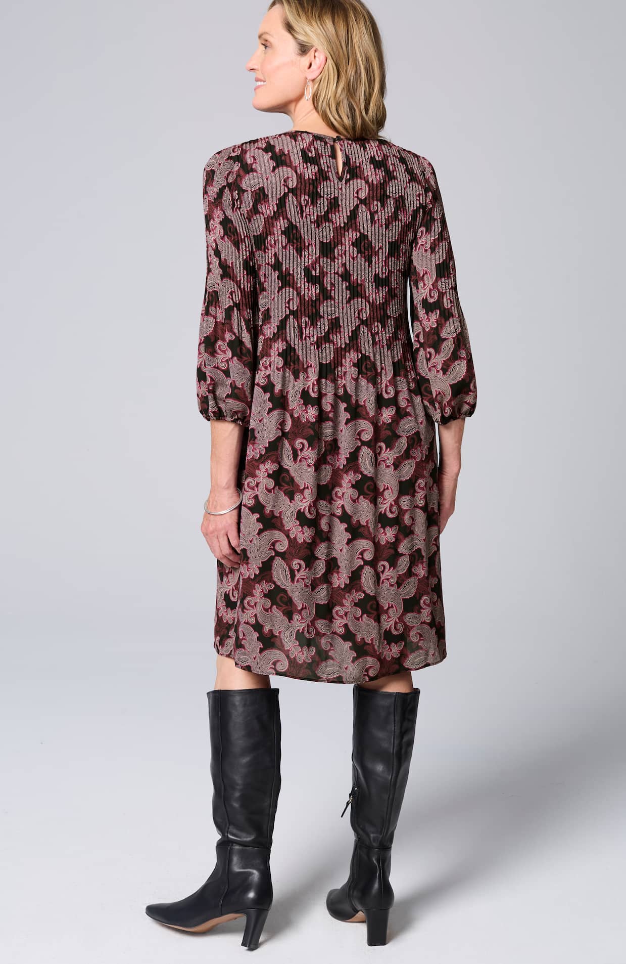 Our A-line dress makes a statement with sunburst pleats that flow with every movement. Back keyhole with button closure. Pair it with sandals or boots for workdays or weekends. Elasticized cuffs. Crew neckline.