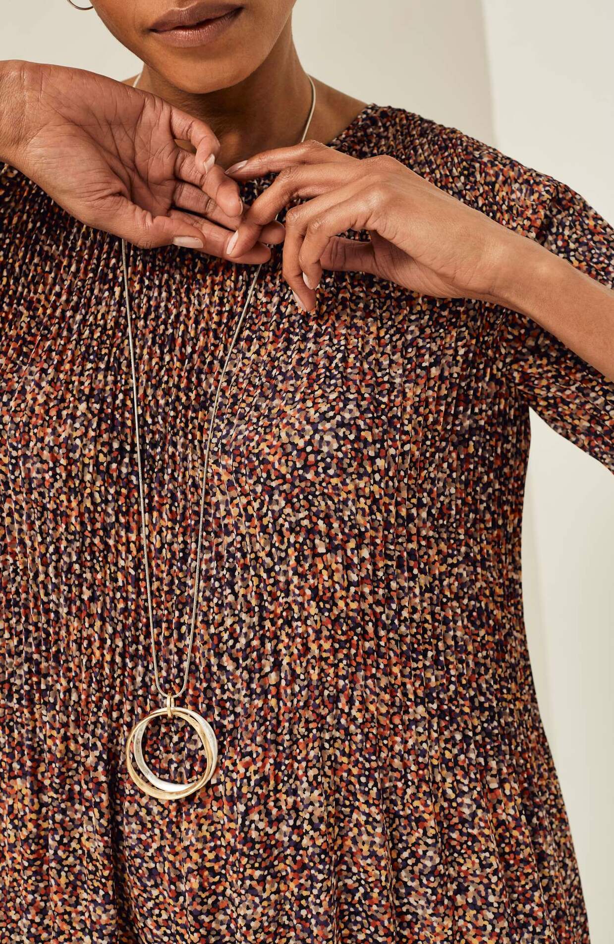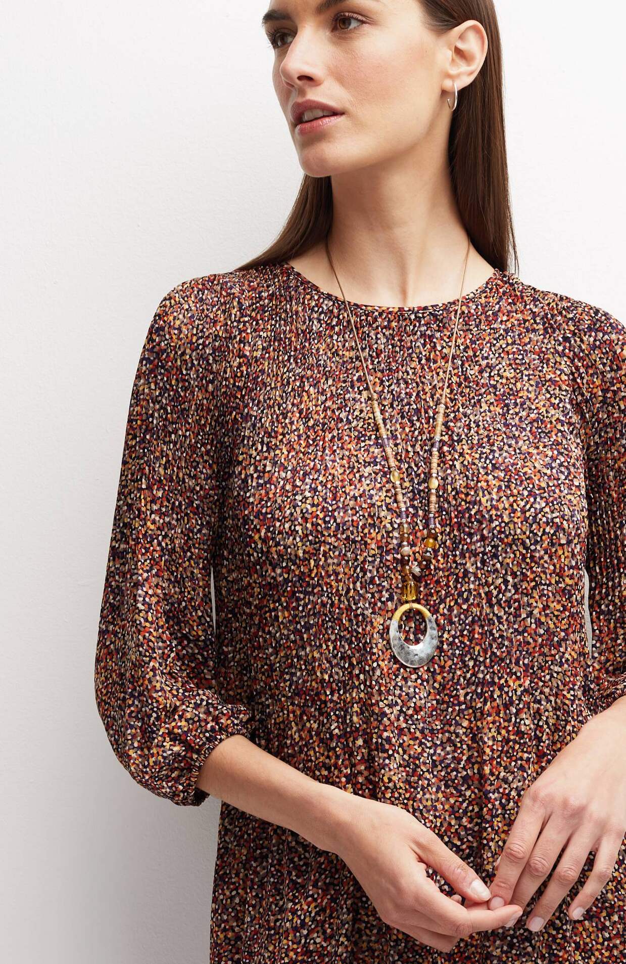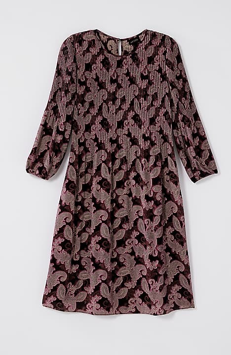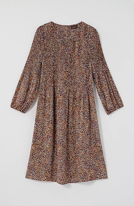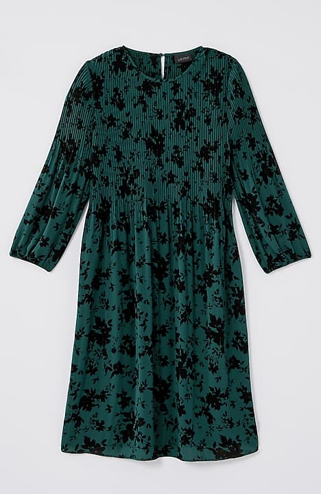 Our A-line dress makes a statement with sunburst pleats that flow with every movement. Back keyhole with button closure. Pair it with sandals or boots for workdays or weekends. Elasticized cuffs. Crew neckline.